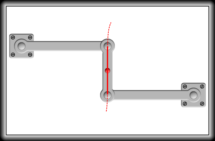 To solve the problem with our single link is clearly impossible: all the points on it describe circles. We must therefore go to the next simple case—our three-link motion. In this case you will see that we have at our disposal the distance between the fixed pivots, the distances between the pivots on the radial links, the distance between the pivots on the traveling link, and the distances of the tracer from those pivots; in all six different distances. Can we choose those distances so that our tracing-point shall move in a straight line?