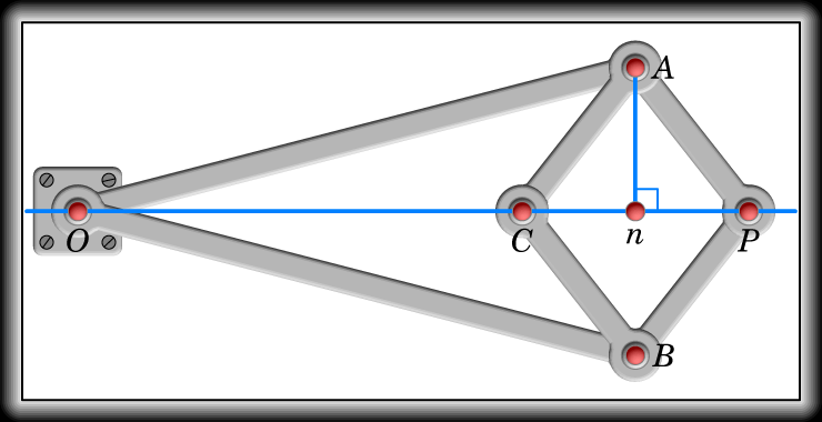 Thus since OA and AP are both constant OC ⋅ OP is always constant, however far or near C and P may be to O. If then the pivot O be fixed to the point O in Fig. 6, and the pivot C be made to describe the circle in the figure by being pivoted to the end of the extra link, the pivot P will satisfy all the conditions necessary to make it move in a straight line, and if a pencil be fixed at P it will draw a straight line. The distance of the line from the fixed pivots will of course depend on the magnitude of the quantity OA2 − OP2 which may be varied at pleasure.