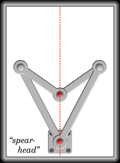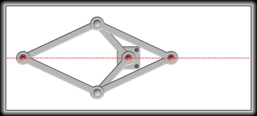 I now come to the second of the parallel motions I said I would show you. If I take a kite and pivot the blunt end to the fixed base, and make the sharp end move up and down in a straight line, passing through the fixed pivot, the short links will rotate about the fixed pivot with equal velocities in opposite directions; and, conversely, if the links rotate with equal velocity in opposite directions, the path of the sharp end will